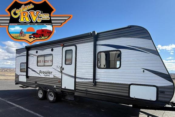 Preowned 2017 Prowler Lynx Travel Trailer 29ft 25 LX by Heartland RV is a comfortable travel trailer perfect for life on the road. It features a rear bath layout and can sleep up to seven people. Inside, a sofa sits straight ahead from the entry door, with open shelving along the wall for extra bedding. The sofa also converts into an additional sleeping area and serves as a divider between the front bedroom and the rest of the trailer, with a curtain for added nighttime privacy. The front bedroom offers a queen-size bed with storage on both sides and overhead. To the left of the entry is a booth dinette with overhead storage, while the kitchen opposite includes a double sink, three-burner range, refrigerator, and pantry. In the rear left corner, there’s a double bed with a bunk above. While the rear right corner houses the tub/shower, toilet, and vanity with sink, plus more thoughtful touches throughout. Has heat/AC. Power awning.