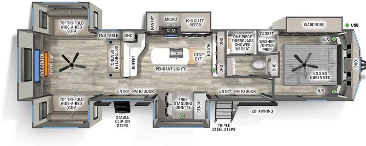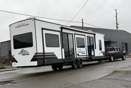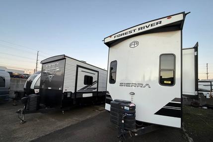 just in--This pre-owned but just like new! 2025 Forest River Sierra Destination 42 ft long--model 403RD is the perfect getaway for families or couples, offering tall ceilings and five slide-outs for plenty of space to relax like you’re at home. Two glass patio doors with screens let in loads of natural light, while the rear den layout and large picture windows deliver stunning ocean or lake views and plenty of room for entertaining. You’ll find two back-to-back hide-a-beds and a theater-style reclining sofa for maximum comfort, plus a 50-inch drop-down TV that can hide away into the counter, paired with an electric fireplace for a cozy touch. The kitchen features a walk-around island, full pantry, buffet-style solid surface counters, and crown molding above the cabinets. A buffet counter makes serving meals simple, with extra counter space and overhead cabinets for easy organization. There’s also a free-standing table and bench and chairs in a dedicated dining area. The bathroom offers a toilet, sink, and a full walk-in shower with a seat and storage cabinets. In the private bedroom, enjoy a walk-around king bed, a wardrobe slide, and a separate closet prepped for a washer and dryer for longer stays. Recessed accent LED lighting ties it all together beautifully. Power Awning. Heat/AC. So much more