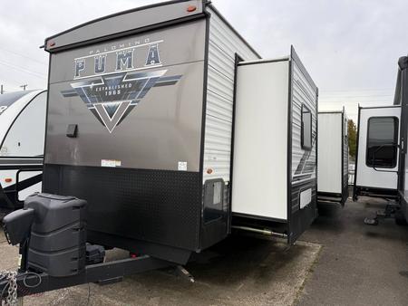 In very nice condition Preowned 2023 Puma Destination 38RLB offers a family-friendly layout with four slide-outs and a glass sliding door with a screen in the living room and kitchen. Back-to-back slides create a roomy, open space perfect for relaxing by the fireplace or gathering around the kitchen island. The middle bunkhouse doubles as an extra bedroom for kids or guests, featuring a bunk over a jiffy sofa and its own closet. For added comfort, there’s a reclining theater-style sofa and a pull out hide-a-bed sofa that can sleep 2. Entertainment options include a smart TV, AM/FM/Bluetooth stereo, and a fireplace with multiple color settings. The kitchen boasts a pantry, quality stove/oven, microwave, refrigerator, high-rise industrial-style faucet with sprayer, and a decorative backsplash for a cozy touch. Dining table for 4 w/chairs. Designer window treatments add charm, while USB charging ports and ample storage, including a hallway closet, keep things organized. The private front bedroom, accessible from the hall or a second access door, features a walk-around queen bed, dresser, and a closet with a washer/dryer already installed. Between the two bedrooms sits a full bathroom with a large shower, toilet, sink, and skylight. Additional features include 50-amp service, heat/AC, and a power awning.