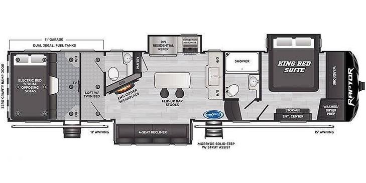 2022 Keystone Raptor Toy Hauler 352 model with 3 slide-outs, 5500-watt generator, fuel station, and solar. Spacious living area/kitchen with large sofa, loft bed above the garage with ladder, and entertainment center featuring a fireplace and swing-mount TV. Walk-around kitchen island with solid surface counters, huge 4-door refrigerator/freezer, convection microwave, conventional oven, and three-burner stovetop. Farm-style sink, ample counter space, plenty of cabinets, slide-out pantry, plus an additional pantry with shelves. The master suite up front has a queen bed (king optional), under-bed storage, large wardrobe, washer/dryer prep closet, dresser. The garage/bunk area includes a rear bathroom, 11' garage with HappiJac power beds (bottom converts to sofas), ramp patio with deck fencing, and 4-season patio door package. Equipped with 2 power awnings and a rear awning over the patio deck. Also features, leveling system, exterior speakers, outdoor shower, and exterior TV hookups. Priced at $59,999, on sale for $56,999 through 2/15/2026 at Coastal RVs and Auto Sales, 360-470-4749