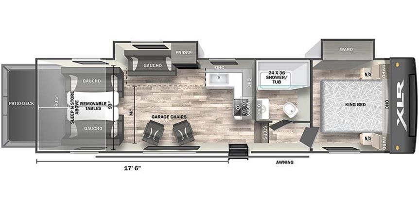 The garage/bunk area has a rear bathroom a full 11' garage with happi jack power beds the bottom bed makes sofas , and a ramp patio with deck fencing along with 4 season patio door package. Has 2 power awnings and a rear awning over patio deck.